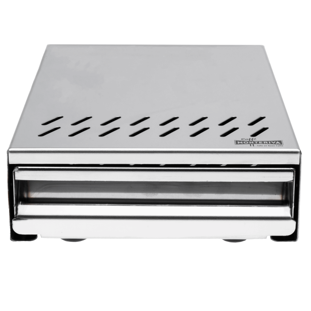 Den triangulära gummipinnen minimerar ljud vid urknackning av portafilter och bidrar till ett mer kontrollerat arbetsflöde. Avdunstningsgallret gör att fukt leds bort även när lådan är stängd, vilket förbättrar hygien och minskar luktbildning. Den integrerade nylonskenan säkerställer ett tyst och jämnt utdrag, medan den blankpolerade kromytan ger ett enhetligt uttryck tillsammans med kromade maskiner och kvarnar.