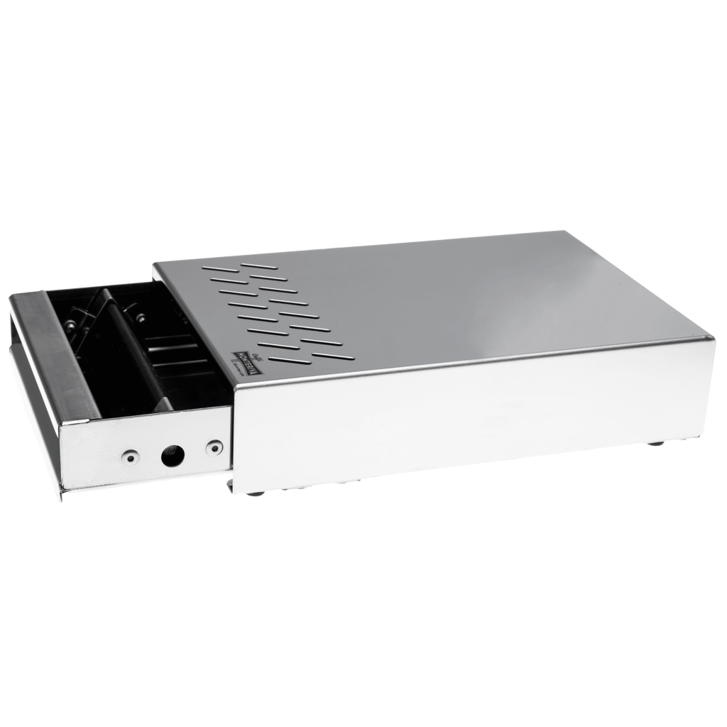 Kompakt sumplåda i krom med låg ljudnivå och stabil konstruktion. Utrustad med ljuddämpande gummipinne, avdunstningsgaller och tyst nylonskena för kontrollerad och hygienisk hantering av kaffesump.
