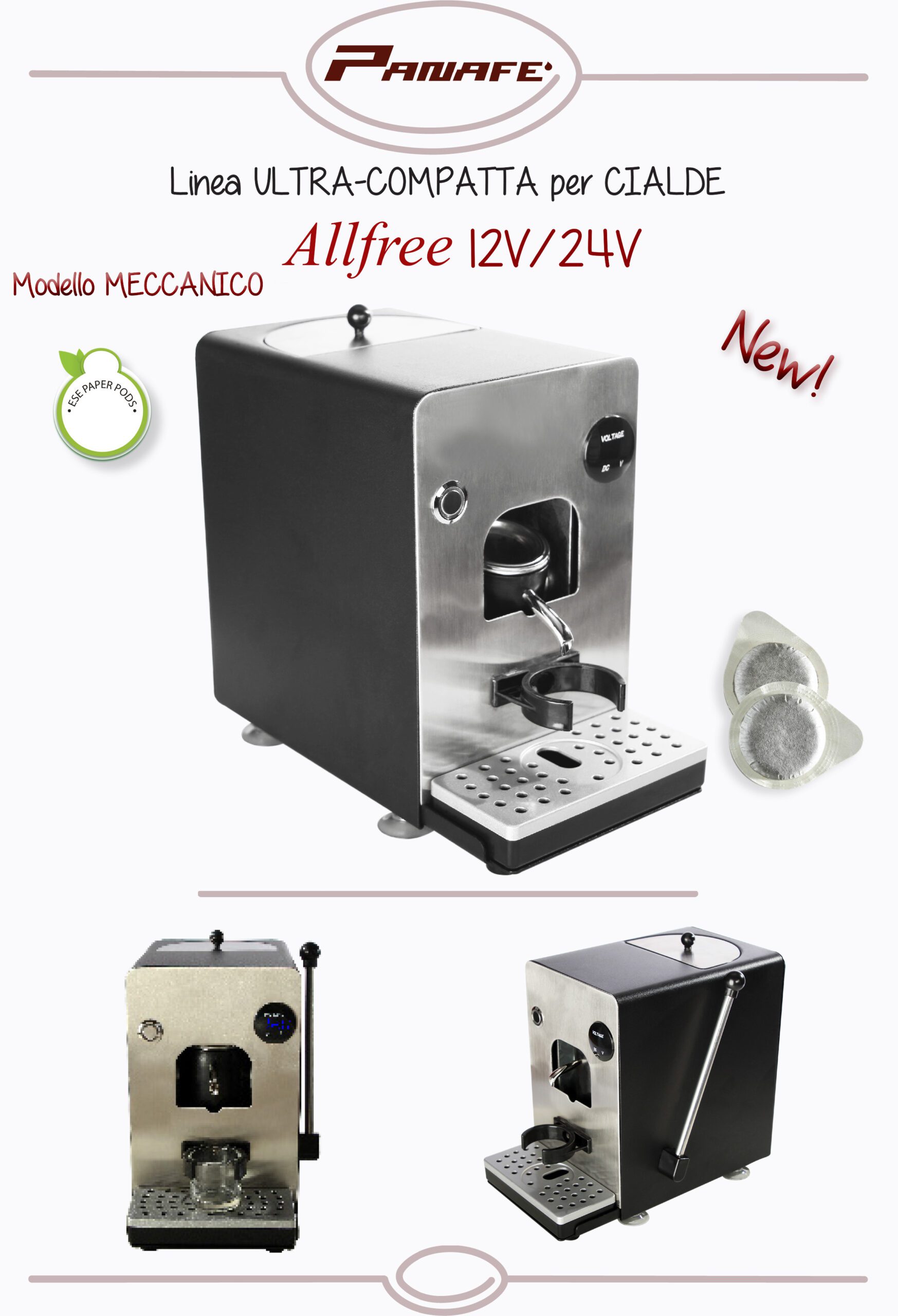 Panafe Allfree är en kompakt och smidig espressomaskin utformad för att leverera kvalitetskaffe var du än befinner dig. Den är kompatibel med ESE 44 mm pods och konstruerad för användning i fordon som bilar, båtar, husvagnar och bussar.