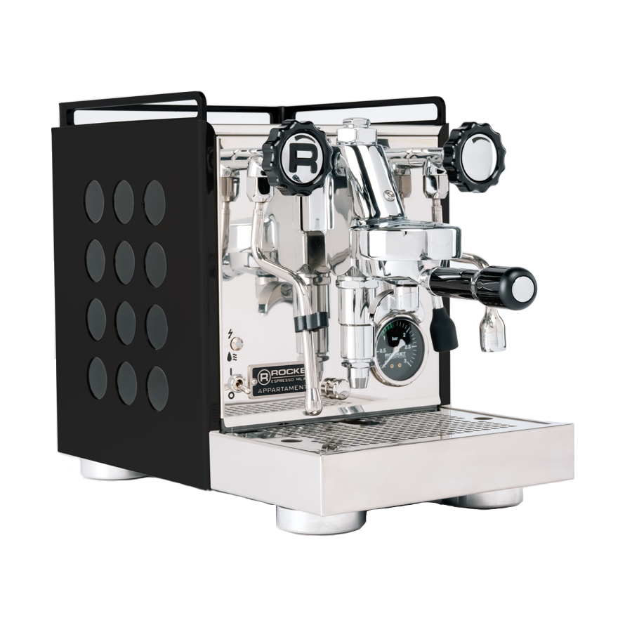 Appartamento 2.0 Black/Black är den vidareutvecklade uppföljaren till Rockets storsäljare, handbyggd i Milano och konstruerad för hemmabaristan som vill ha stabil bryggprestanda, stark ånga och en kompakt premiumdesign. Kombinationen av E61-brygghuvudet och värmeväxlaren levererar konsekvent temperatur och ett responsivt arbetsflöde vid både espresso och mjölktexturering.