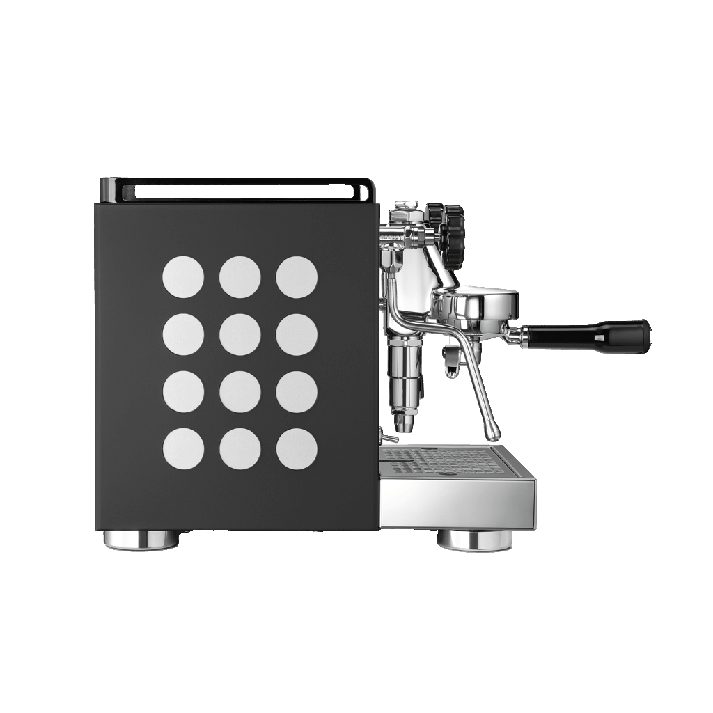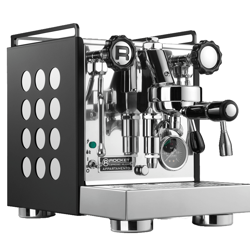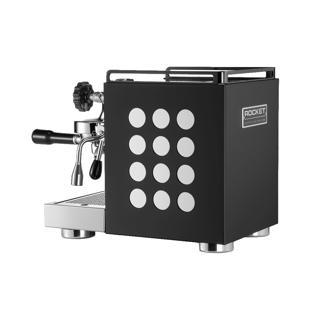 Rocket Appartamento är den mest kompakta espressomaskinen från Rocket Espresso och riktar sig till hemmabaristan som kräver samma konstruktion som i professionella maskiner, men i ett mindre format. Med sin eleganta svarta finish och vita cirklar på sidorna kombinerar den klassisk design med modern estetik.