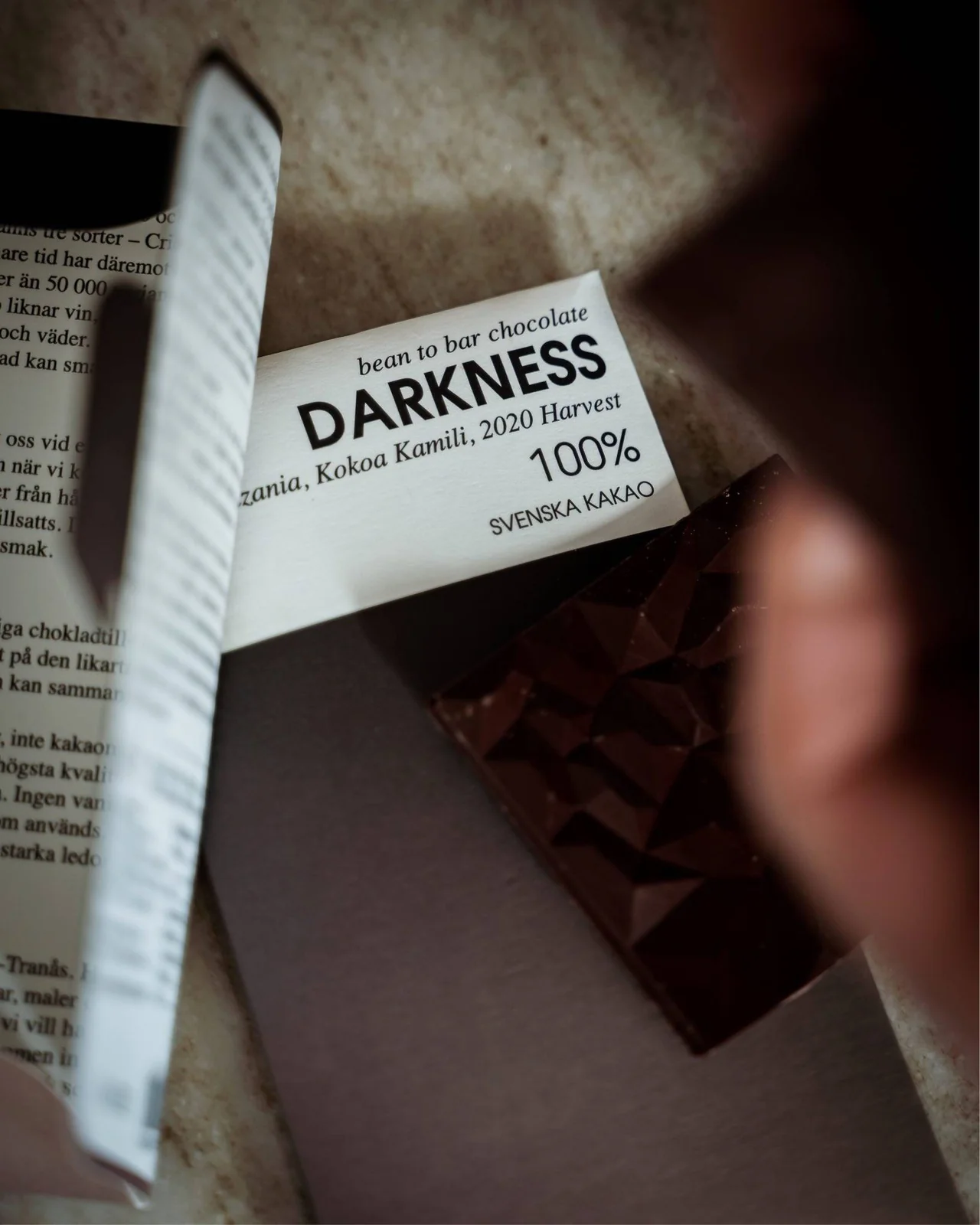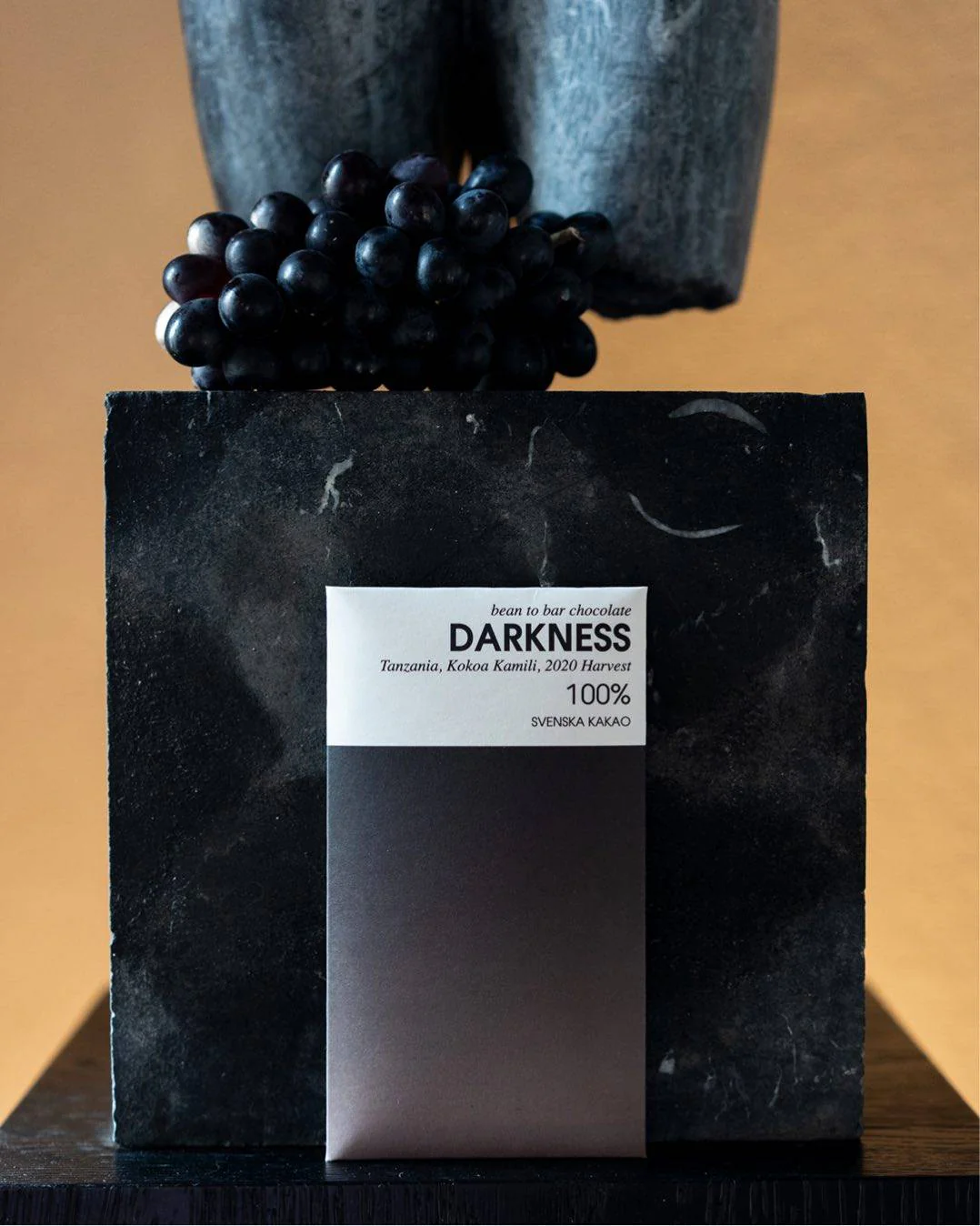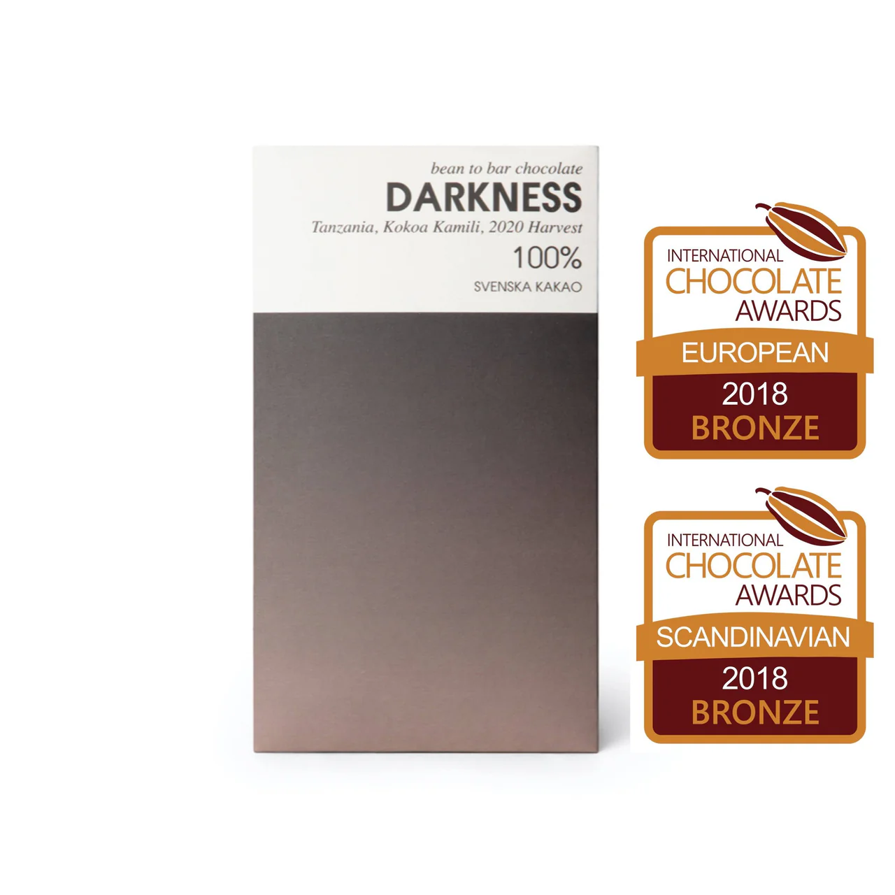 Svenska Kakao Darkness är en extra mörk chokladkaka med 100% kakaohalt, tillverkad i Skåne av noggrant utvalda Trinitario-bönor från Kokoa Kamili i Mbingu, Tanzania. Denna choklad erbjuder en djup smakprofil med intensiva toner av nötter, russin och torkade fikon, trots avsaknaden av socker. Chokladen produceras utan tillsatser och med varsam rostning för att bevara de naturliga smakerna. Svenska Kakao fermenterar och torkar bönorna lokalt för att kontrollera hela processen och säkerställa högsta kvalitet. Chokladen är glutenfri men kan innehålla spår av mjölk, nötter och ägg.