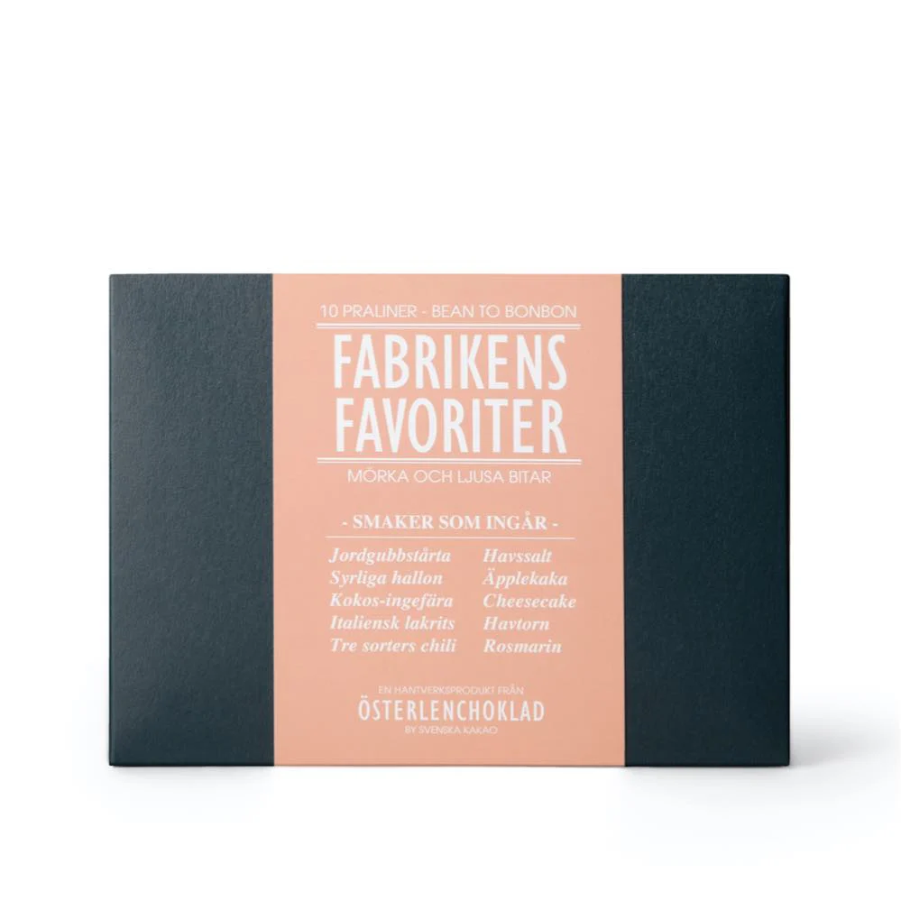 Svenska Kakao Fabrikens Favoriter är en pralinask med 10 utvalda praliner, doppade i mörk och mjölkchoklad. Chokladmakarna på Svenska Kakao tillverkar varje pralin i sin fabrik på Österlen, med choklad som framställs av egen bean to bar-produktion. I asken finns smaker som Äpplekaga, cheesecake, jordgubbstårta, hallon, lakrits, chili, havssalt, havtorn, rosmarin och kokos/ingefära. Råvarorna kommer från utvalda odlare – både lokalt och internationellt – för att säkerställa hög kvalitet.